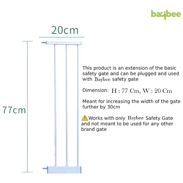 • BRAND : BAYBEE • DIMENSION : 20 CM • MATERIAL : METAL • Safety gate extension in Size . Adjustable to door and stair width. Color -White • White stairgate extension for more security - Let your kids roam free without