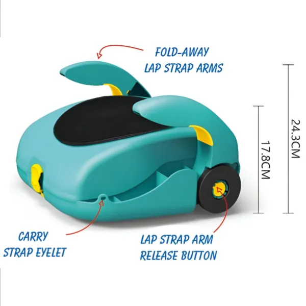• Seat designed to work with any three-point seat belt, attaches to any car • books or clothes for the trip. Ideal for traveling everywhere! With wheels to be dragged through the airport or wherever by your little one anywhere like a mini carry-on luggage • Measurement 14.8cm x 40.6cm x 39.5cm Recommended weight for children from 22 to 36 kilos and a height of 125 cm or more